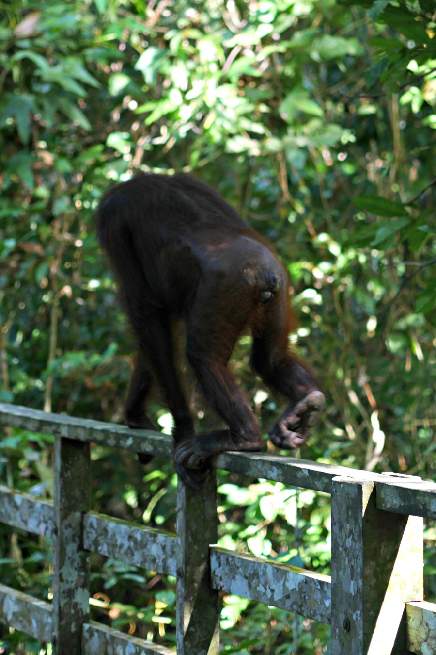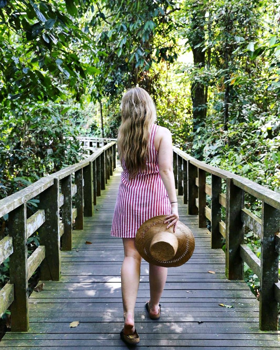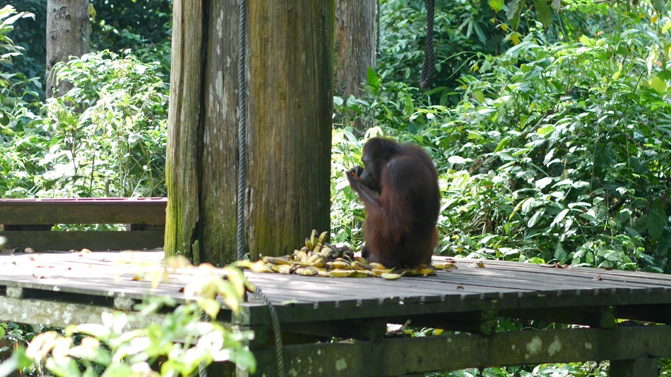 The afternoon feeding was much quieter with less people, and thankfully no tour groups or loud screaming children. And then the unimaginable happened…the Orangutan climbed off the platform and walked away through the forest floor. We wandered back along the boardwalk and all of a sudden, she was there, right in-front of us. She had followed the path that the volunteers take from the platform to the boardwalk through the jungle, and so she was casually sat on the wooden rail watching us as we walked. I took a couple of photos, my hands shaking, and then a ranger appeared and told her to move on.