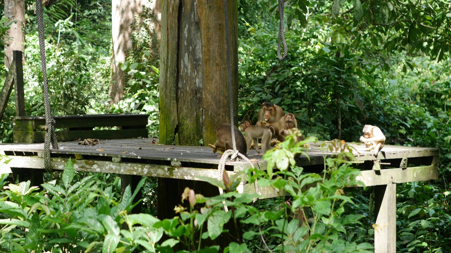 You have to be *really* quiet when you’re waiting as any noise scares the Orangutans away. Unfortunately there was a large tour group from mainland China, and all of them were SO noisy and wouldn’t be quiet no matter how much they were told to be quiet, so sadly no Orangutans turned up. When it was evident no Orangutans would be appearing, the greedy Macaques descended on the platform and quickly ate everything!