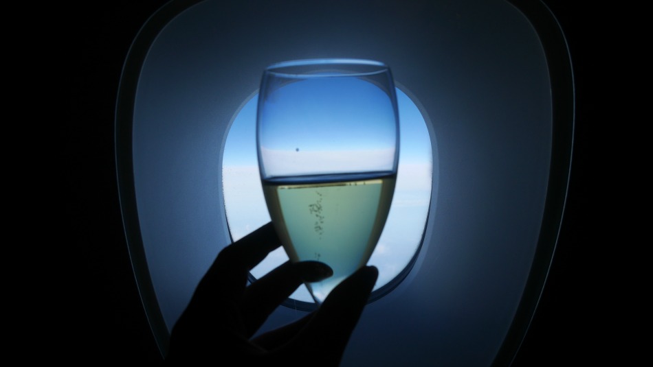 Glass of champagne in front of the plane window