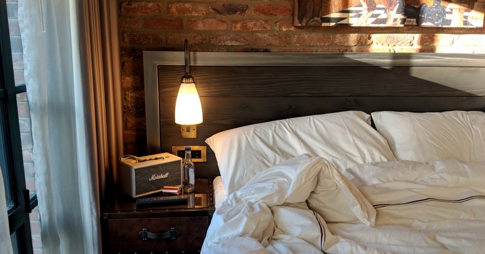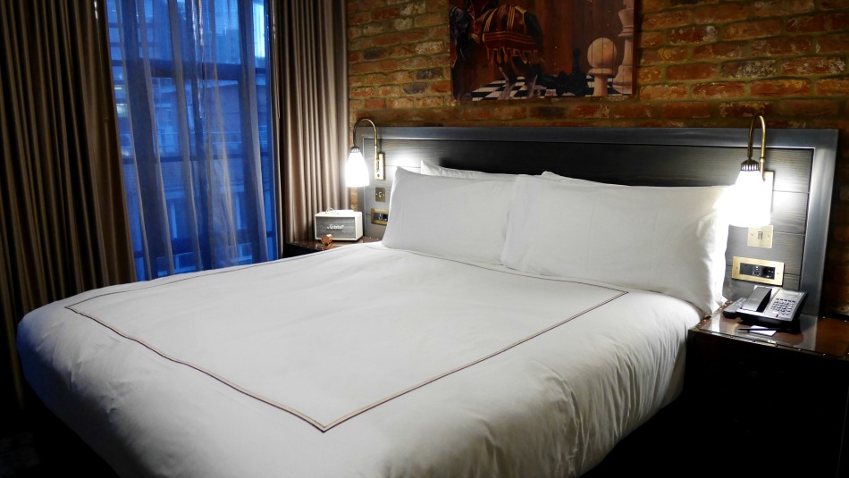 As well as the cocktail station there is also an in-bathroom steam shower room (which to be honest smelt horrifically of mould, but that didn’t stop me being so over-excited I tested it out despite my severe mould allergy). The bathroom itself is cosy but beautiful, with a monochrome design of white and black throughout. The Curtain’s personality continues into the bedroom, where there are open brick walls and bedside tables flanking the king-size bed resembling old trunks, and a Marshall radio sat atop one of them.